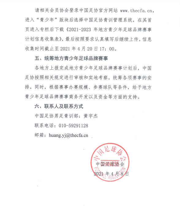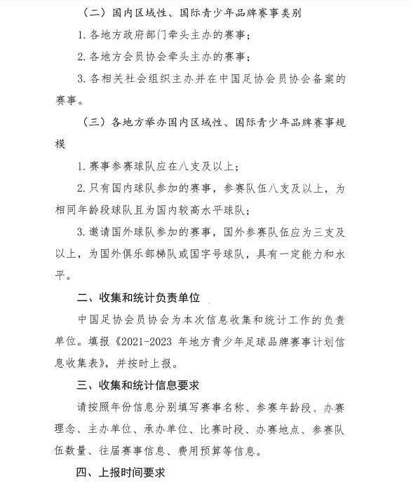 中国足球协会于2021年4月8日下发了《中国足球协会关于统计各地方青少年足球品牌赛事计划的通知》,现请福建省内各会员协会、相关单位根据通知要求于4月18日18:00前将信息收集表发送至福建省足协邮箱:fj